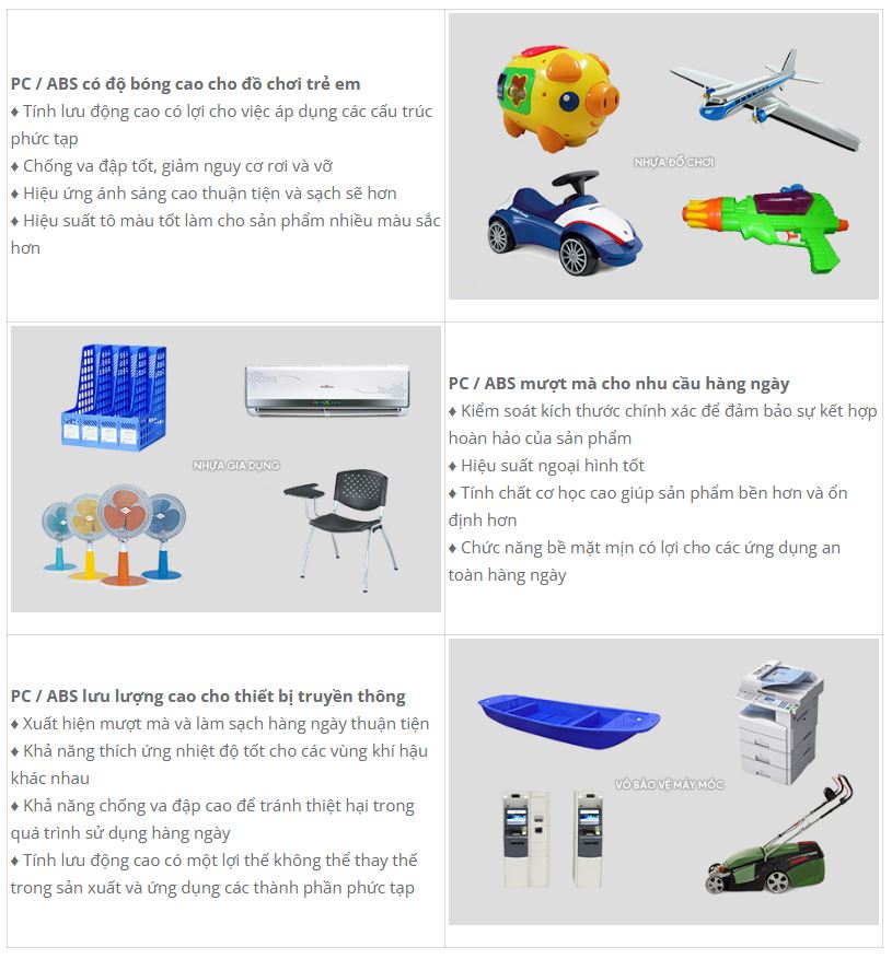 Nhựa PC / ABS là một loại mới thường được sửa đổi bởi PC và ABS. Nó có những ưu điểm của PC và ABS, và bổ sung các điểm yếu của nhau để trở thành một loại nhựa compound đa năng và nhiều ưu điểm hơn. Sự kết hợp giữa PC/ABS là vật liệu mới cho sản xuất công nghiệp, được sử dụng rộng rãi trong các thiết bị sinh hoạt và công cụ sản xuất, có nhiều lợi thế không thể thay thế ở những loại nhựa khác.